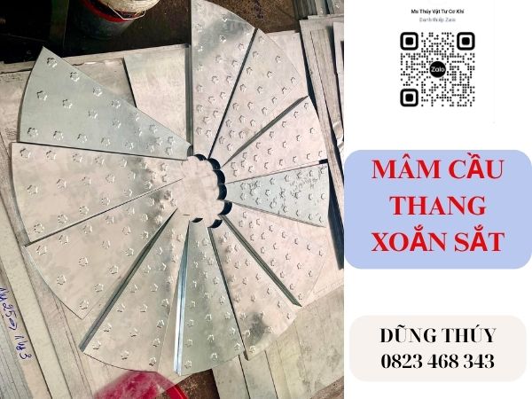 Mâm cầu thang xoắn bằng sắt là bộ phận bậc thang dạng hình quạt hoặc hình tròn, được sắp xếp xoay quanh một trụ trung tâm để tạo thành cấu trúc cầu thang xoắn. Mỗi mâm chính là một bậc đi riêng biệt, thường được làm từ sắt tấm có thể dập hoa văn, tạo gân chống trượt hoặc cắt CNC tùy theo yêu cầu sử dụng và thiết kế thẩm mỹ.