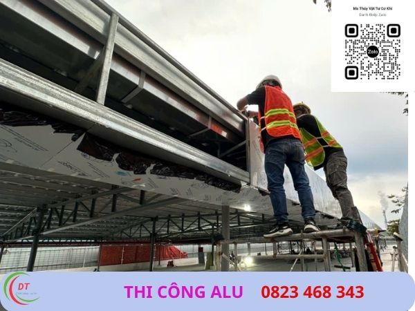 - Sau khi khung xương hoàn thiện, đội thi công tiến hành lắp đặt tấm alu bằng vít chuyên dụng và keo dán băng keo 2 mặt.